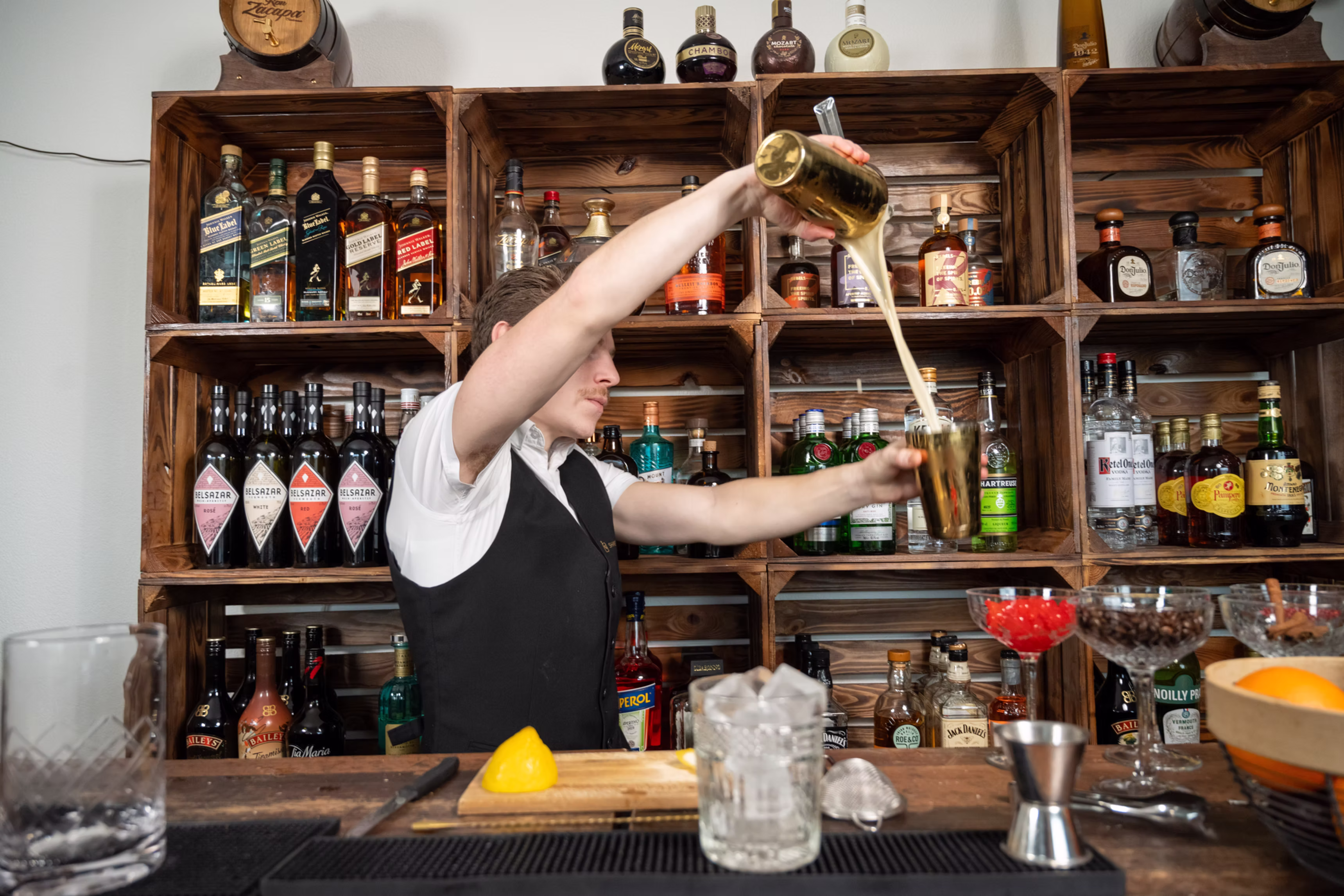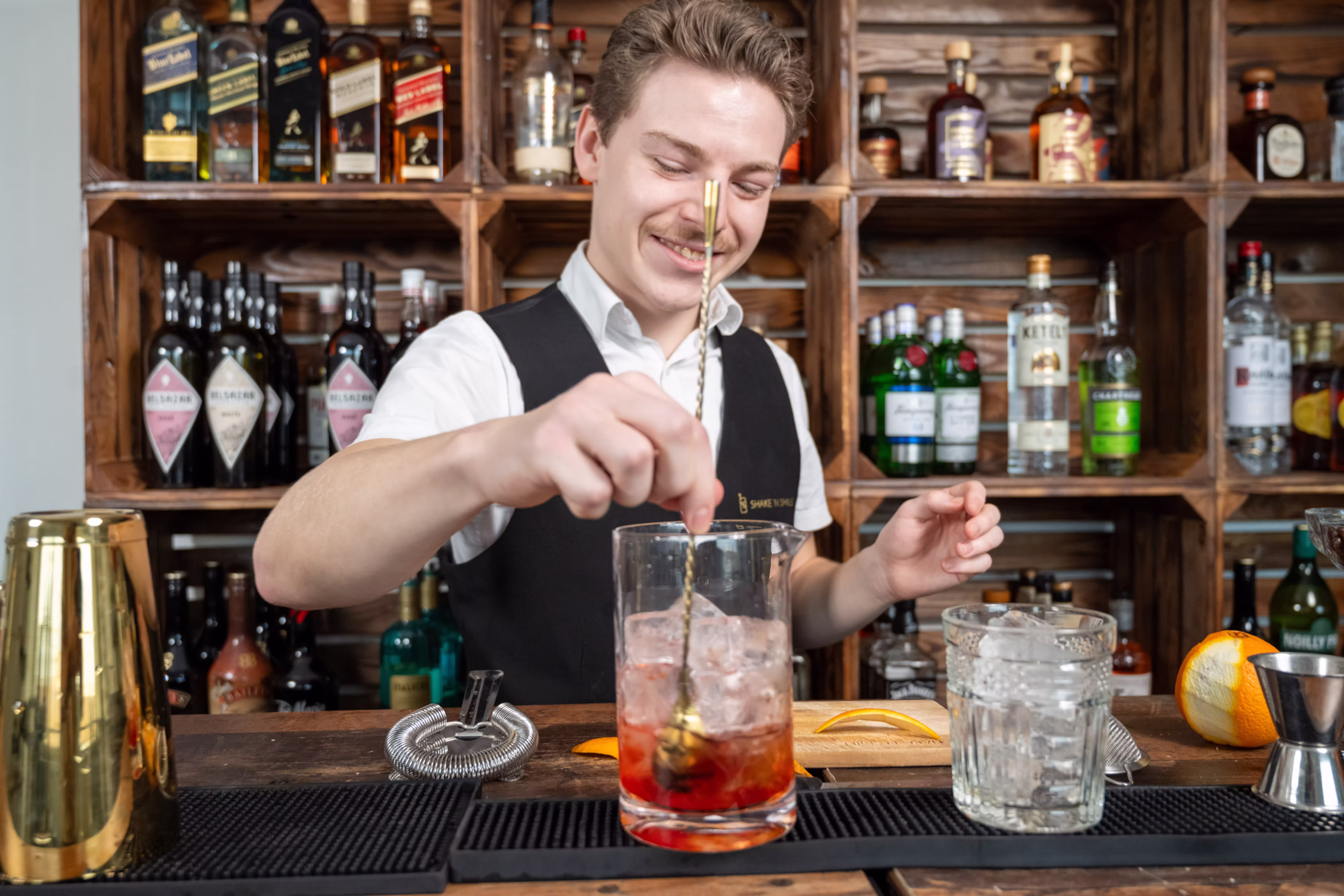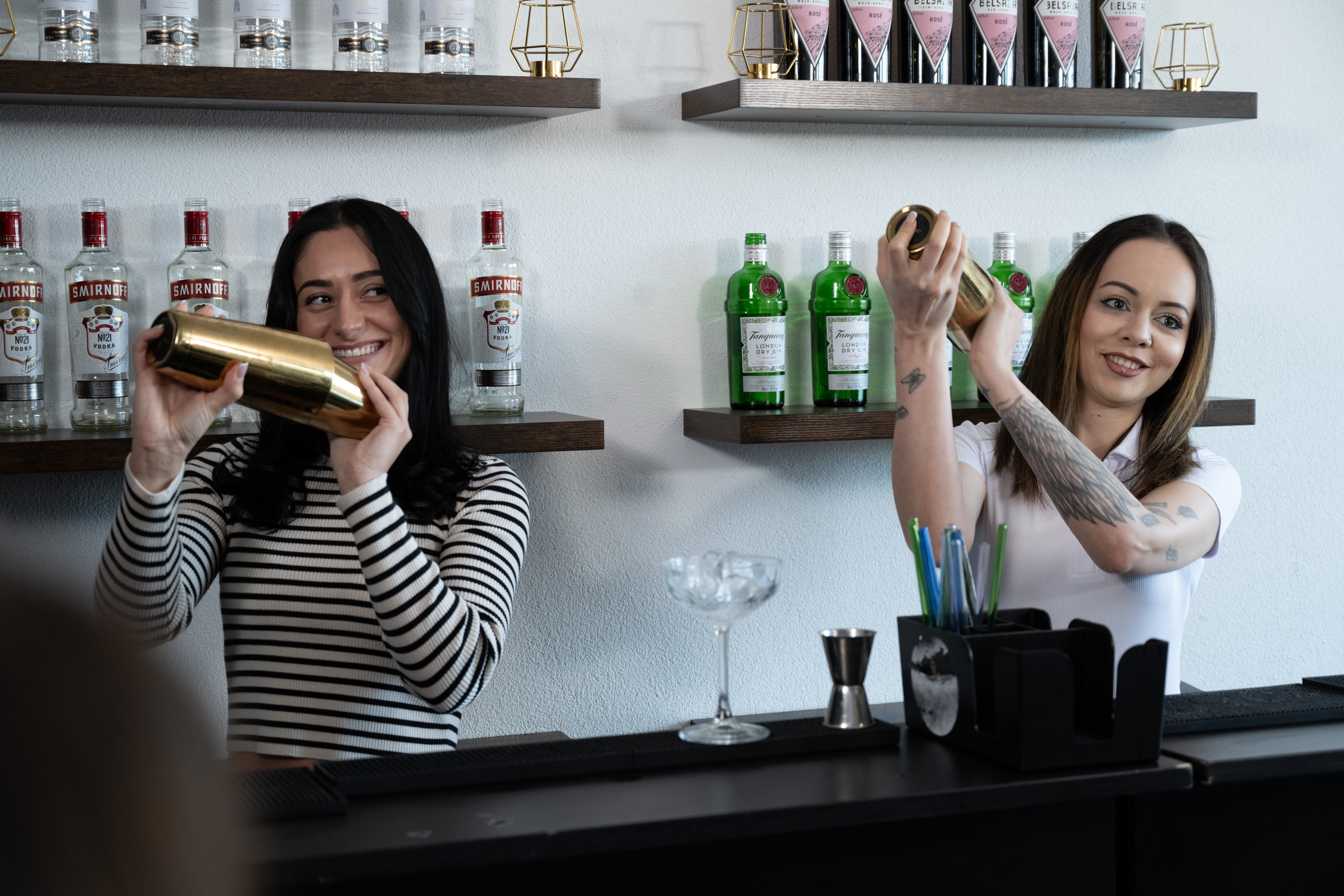 - Beherrschung verschiedener Bartending-Techniken: Building, Stirring, Shaking, Rolling, Layering, Muddling, Churning, Shaking and Stirring